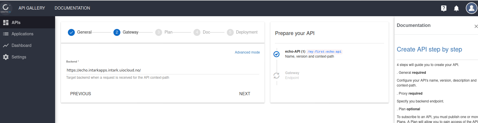 Context-path er en del av URL-en til APIet. Eksempelet over som fører til for UiOs gateway vil være tilgjengelig på URLen https://gw-uio.intark.uh-it.no/my-first-echo-api