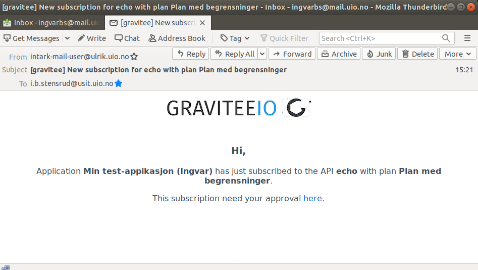 Etter at tilgang er godkjent eller avvist blir det sendt en automatisk generert e-post til eier av applikajsonen. Om det er en plan med API-nøkkel kan en av eierne av applikasjonen logge inn og hente API-nøkkelen. Du trenger i utgangpunktet ikke sende API-nøkkelen til søker, nøkkelen er hemmelig og skal uansett ikke sendes i klartekst.