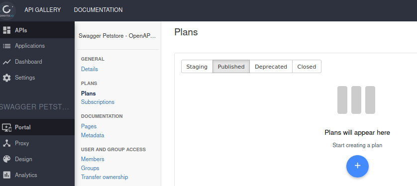 Opprett en ny plan ved å gå til API-et, velg Plans og trykk på plusstegnet